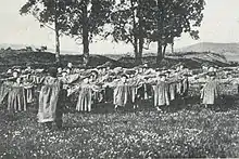 Following organizational shakeup of the party executive in 1934, the new leader Manuel Fal entrusted her with re-modeling the Secciones Femeninas of Comunión Tradicionalista.[76] Female groupings, known as Margaritas, operated as affiliated with local circulos; apart from boosting membership and launching new activities, Urraca was entrusted with turning the organization from very loose federation into a nationwide structure; since the task has never been fully completed she did not assume formal presidency,[77] though some scholars name her de facto leader.[78] Up to 1936 Margaritas recruited 23,000 women,[79] mostly in Valencia, Navarre and Vascongadas.[80] Urraca encouraged them to take courses in nursing (and took it herself),[81] getting ready to the anticipated violent overthrow of the Republic. In 1936 she unsuccessfully run for the parliament again, this time from Teruel.[82] Urraca continued her favorite social activities setting up Socorro Blanco, the Carlist relief organization.[83] In the movement's press she campaigned for Spiritual Crusade of Prayer.[84] In April 1936 she was detained for illegal possession of a pistol[85] but was smuggled out of custody and spent the last few months of peace hiding in a village of Arcos de la Llana near Burgos.[86]