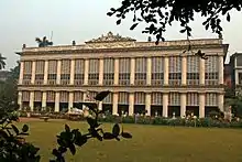 The house is Neoclassical in style, while the plan with its open courtyards is largely traditional Bengali. Adjacent to the courtyard, there is a thakur-dalan, or place of worship for members of the family. The three-story building has tall fluted Corinthian pillars and ornamented verandas with fretwork and sloping roofs, built in the style of a Chinese pavilion. The premises also include a garden with lawns, a rock garden, a lake and a small zoo.