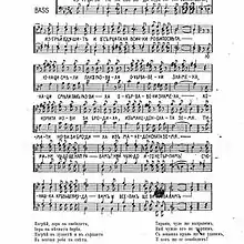 The "March of the Macedonian Revolutionaries" (Bulgarian: „Марш на македонските революционери“) (Macedonian: „Марш на македонските револуционери“) also known as "Rise, Dawn of Freedom"; (Bulgarian: „Изгрей зора на свободата“) (Macedonian: „Изгреј зора на слободата“) is a Bulgarian march which was used by the Internal Macedonian Revolutionary Organization (IMRO), the Macedonian Patriotic Organization (MPO) and was shortly the anthem of the Socialist Republic of Macedonia before the adaptation of the Today over Macedonia anthem.[1] Today, the march is still used by the MPO, as well as by VMRO-BND and the Radko Association.[2][3][4][5]