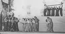 In 1934, German exile Kurt Jooss and his dance group arrived at Dartington, and Barr resigned rather than work under Jooss' direction.[4][5][11] She became director of a permanent corps de ballet attached to the new Experimental Theatre in London.[15] Its first production was Pacific, incorporating Polynesian dances.[15] It was at this time that Barr began using the term "dance-drama".[6] Her works from this period carried pacifist and communist-derived political messages,[4] and were set to music by contemporary composers such as Edmund Rubbra and Michael Tippett.[4] She contributed to the 1938 Festival of Co-operation at Wembley Stadium, directed by André van Gyseghem, by training "a ballet of mourning women and a ballet of exultant men of the future".[16]