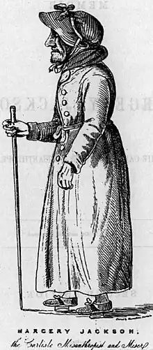 In the very heat of summer [Miss Jackson] was sometimes seen dressed in an old washed-out yellow gown, which she always held up so as to exhibit a yellow white petticoat; she would then also wear a blackish silk cloak, something of the scarf shape, which might have been Margery's finest adornings for thirty or forty years, but her favourite and general dress was an old gray duffle coat, – none of your mandarins, full and short, with hanging sleeves, – but tight every way, and only so short as to save the bottom from wearing away against the stones, and expose to view her gold buckles, the same, we may suppose, as graced the under-members of her great-grandmother centuries ago! This said grey doublet was confined at the old maiden's waist with a hemp-cord, and had a hood, which was drawn up under a brownish-black bonnet of indescribable shape; she generally used pattens, and carried in her hand a gold-headed cane.[2]: 18