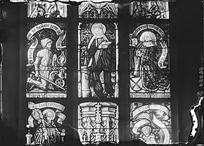 The 59 glass windows, created in the workshop of Peter Hemmel of Andlau,[1][8] between 1480 and 1489,[2] are of particular historic and cultural value.[2] Stained-glass windows are usually made by joining pieces of coloured glass with H-shaped lead cames, a cold process.[9][10] Here, however, the glaziers used glass fusing: pieces of coloured glass (60-80 per pane) were fitted into a mosaic on a piece of clear glass, and the stack was then gently heated to soften and fuse the layers without melting them into a puddle.[2] This is a difficult technique: it requires careful matching of the physical properties of the glass, to avoid internal stresses which can cause the glass to fail.[11] However, done properly, it can produce a strong, even window pane.[12] Details were painted onto the glass;[8] traditional stained-glass window painting is lasting, as it uses a glass-fusible paint, fired before the pieces are assembled.[9][10] The windows show religious themes, and include depictions of the donors.[5]