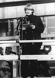 Birthler gives an address during the Alexanderplatz demonstration on 4 November 1989