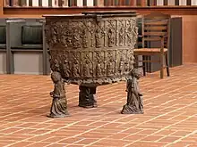 - A bronze baptismal font made by Hans Apengeter (1337). Until 1942 it was at the west end of the church; it is now in the middle of the chancel. It holds 406 litres (89 imperial gallons; 714 imperial pints), almost the same as a Hamburg or Bremen beer barrel, which holds 405 litres (89 imperial gallons; 713 imperial pints).[10]