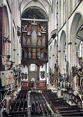 At the same time, a treasure chamber was made for the Danzig Parament Treasure from St. Mary's Church in Danzig (now Gdańsk), which was transferred to Lübeck after the War. The Parament Treasure is now exhibited at St. Anne's Museum), where a large organ loft had been built. The organ itself was not installed until 1968.