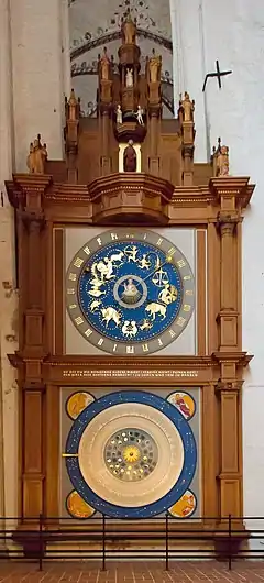 The astronomical clock was built in 1561–1566. It used to stand in the ambulatory behind the high altar, but was completely destroyed in 1942. Only a clock dial that was replaced during a previous restoration remains, in St. Anne's Museum. The new Astronomical Clock was installed on the East side of the Northern transept, in the Danse Macabre Chapel. It is the work of Paul Behrens, a Lübeck clockmaker, who planned it as his lifetime achievement from 1960 to 1967. He collected donations for it, made the clock, including all its parts, and maintained the clock until his death. The clock front is a simplified copy of the original. Calendar and planetary discs controlled by a complicated mechanical movement show the day and the month, the position of the sun and the moon, the signs of the zodiac (the thirteen astronomical signs, not the twelve astrological signs), the date of Easter, and the golden number.