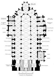 - ↑ German: mit größter Wahrscheinlichkeit die erste und einzige gotische Orgelfassade mit einem Zweiunddreißigfuß-Prinzipal (tiefste Pfeife rund 11 Meter lang) in der damaligen abendländischen Welt