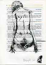 In 2007 Marina Skugareva presented the project of drawings "Good Housekeepers". It develops the subject of a naked figure in space, detecting new accents. In the majority of drawings Marina uses texts from women's Internet-chats which, being imposed on the naked figures, turn into tattoos.[3] The author's speculative strategy becomes comprehensible through the construction of drawings. The combination of the image and the text is used for "blackouting" the substance and the discrepancy. Texts represent the infinite women's conversations and images fix the forms of a human movement and frozen emotions. For the artiste the subject is just a springboard, she is not poeticizing the daily routine, but is rather gaining a victory over it with the help of art.[4]