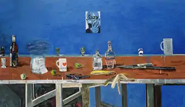 Since the middle of the 1990s Marina Skugareva has been working on the project of still lifes—"Tables". The painter transforms the oblong canvases ("Ronald", "Radio-gramophone", "Evening news"), cut across by the long near-empty tables, with the portraits of characters fixed on a conditional wall above, into the collision of several realities: the interior with the painting is continued in itself and the subjects represented in a picture are tested on reliability, so that glasses and chairs are made to seem more real than portraits.