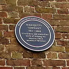 On 21 November 2005 the mayor of Windsor and Maidenhead placed on The Limes a blue plaque in her honour which reads: 'Marquita Tennant lived here and started her work to help the poor women of Windsor'.
