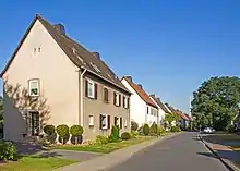 Bereitsschaftssiedlung shift supervisor's housing on Hiberniastraße, built by IG Farben 1938-42, with the plant in the background