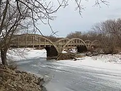 The Marsh Rainbow Arch Bridge, also known as the Coon River Bridge and Rainbow Bend Access, is located south of Lake City, Iowa, United States. The 271-foot (83 m) three-span bridge carried traffic on Iberia Avenue over the North Raccoon River.[2] It was designed by Des Moines engineer James Barney Marsh in his patented rainbow arch configuration, and constructed by the Iowa Bridge Company in 1914 for $10,970.[3] It replaced a Howe truss bridge that had been built by the King Bridge Company of Cleveland. That bridge was put in service upstream and remained in use until 1983 when it was taken down.[2] The Marsh arch bridge was bypassed in 1985, and remains in place in a county park. It was listed on the National Register of Historic Places in 1989.[1]