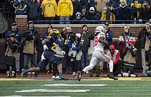 Harrison set career highs in receptions (10) and yards (185) in a 44–31 victory over Penn State.[32] Two weeks later he would once again have a 100-yard game, this time against Indiana.[33] Against rival Michigan Harrison recorded his sixth 100-yard performance of the season in a 45–23 loss, the Buckeyes first of the season.[34][35] Despite the loss to Michigan, Ohio State earned a bid to the College Football Playoff where they would play the defending national champion Georgia Bulldogs in the Peach Bowl.[36] Leading up to the game, Harrison's matchup against corner Kelee Ringo was viewed by many as the potential key to the game.[37][38][39][40] Harrison shone in the first half of the contest, catching five passes for 106 yards and two touchdowns, helping Ohio State gain a 35–24 lead.[41][42] In the third quarter he was forced to leave the game with a concussion following a hard hit from Javon Bullard.[43] In Harrison's absence Georgia mounted a comeback to win the game 42–41, ending Ohio State's season.[44][45] At the conclusion of the season, Harrison was voted a unanimous All-American and named the Richter–Howard Receiver of the Year after recording 1,263 yards and 14 touchdowns.[46][47]