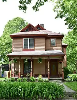 The Mary A. and Caleb D. Scott House is a historic building located in Des Moines, Iowa, United States. This 2½-story dwelling features a hipped roof with gablets, various gables, reeded panels along cornice and base, and a shed-roofed porch with brackets, turned columns, and an open grill. The property on which it stands is one of ten plats that were owned by Drake University. The house's significance is attributed to the effect of the University's innovative financing techniques upon the settlement of the area around the campus.[2] Charles H. Atkins and R.T.C. Lord owned the property between 1887 and 1888. Mary A. Scott bought the property in 1888 and the house was built the following year. She lived here in 1889 with Caleb D. Scott, a streetcar conductor, and James L. Scott, who was retired. The Scotts lived here until 1899. The house was listed on the National Register of Historic Places in 1988.[1]
