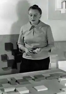 Martin moved towards pure abstraction in the late 1940s painting her first abstract picture in 1950, made her first reliefs in 1951 and her first free-standing construction in 1956. Martin and her husband collaborated on the Environment section of the seminal exhibition This Is Tomorrow.[4] Martin participated in group exhibitions of constructed art in England and abroad, notably Konkrete Kunst, Zürich 1960, and Experiment in Constructie, Stedelijk Museum, Amsterdam, 1962. Martin designed a screen for the Musgrave Park Hospital in Belfast (1957), reliefs for the Orient Line's S.S. Oriana (1960) and a wall construction for the University of Stirling.[5][6]