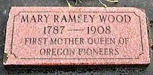 Mary Ramsey Wood, also known as Mary Ramsey Lemons Wood (May 20, 1787/circa 1810 (disputed) – January 1, 1908), was an American pioneer known as the "Mother Queen of Oregon". She was reported to be the oldest living person in the United States when she died, supposedly aged 120. It is said she traveled to the Oregon Territory across the Oregon Trail aged 66. There is evidence this age claim was inaccurate or exaggerated, however, and she may have been between 96 and 98 when she died.[1]