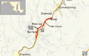 Maryland Route 935 (MD 935) is an unsigned state highway in the U.S. state of Maryland. The state highway runs 2.99 miles (4.81 km) from MD 36 in Barton north to MD 36 in Nikep. MD 935 is the old alignment of MD 36 through Barton, Moscow, and Nikep in the Georges Creek Valley of western Allegany County. The state highway was designated when MD 36 moved to a new alignment through the communities in the early 1980s.