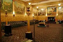 German-born mural artist Gustave A. Brand (1862-1944) was commissioned to create twenty-two giant paintings for the two Masonic lodge meeting rooms of the Muncie Temple.[6] These huge 12' x 14' paintings depict scenes from both the Old and New Testaments of the Bible, and several feature King Solomon and Solomon's Temple in Jerusalem. The scenes were painted on canvas and are permanently affixed to the walls on all four sides of the lodge rooms.