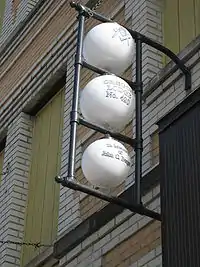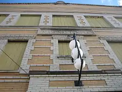 At the apex of the building is a low pitched, triangular parapet/pediment. A central raised shield above the parapet is etched with the date "1900" as well as the Masonic emblem. Around the pediment is more ivory brick work, dentils and three corbelled courses.[1] Dangling from the second story of the building, above the door, is a milk glass globe sign emblazoned with the lodge number, the Masonic symbol and a building dedication.