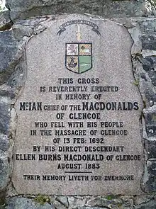 - ↑ "Glencoe, Massacre of Glencoe Memorial (site NN15NW 4)". Canmore: National Record of the Historic Environment. Retrieved 13 October 2019.