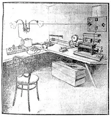 In December 1902 the American De Forest Wireless Telegraph Company set up an earlier station in an existing house on a beach near Point Judith Light and another near Block Island Southeast Light, 15 miles (24 km) from the coast.[8] By May 1903 they had successfully exchanged test messages.[9] Messages were sent using Morse code.[10] The stations were initially operated for the Providence Journal to send news stories to the island to be printed locally. Another goal was that passing ships could also send messages to the mainland which would then be relayed to Providence or New York City by telephone arriving hours before the ships reached port. At this time few places in the world were passed by so many ships as Block Island.[8] The Block Island Wireless began publishing in July.[11][12] At the time it was one of only two daily newspapers that printed dispatches sent by wireless.[lower-alpha 1][13] The stations soon began sending messages (called "aerograms") for the public and charging a fee for the service.[14] Initially, this experimental wireless service was only intermittently successful and the Block Island Wireless ceased publication at the end of August 1903.[10][11]