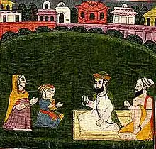Janamsakhi painting depicting Guru Nanak visiting Mata Sulakhni and his two sons