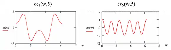 Figure 1. Some plots of -periodic 1st kind even Mathieu functions. Elliptic cosines shape for the following set of parameters: a) =and q = 5 ; b) =and q = 5.