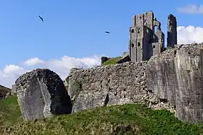 The ruins of Corfe Castle in Dorset, within whose dungeon Maud de Braose and her son William were starved to death