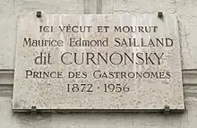 Maurice Edmond Sailland[lower-alpha 1] (October 12, 1872, in Angers, France – July 22, 1956, in Paris), better known by his pen-name Curnonsky (nicknamed 'Cur'), and dubbed the Prince of Gastronomy, was one of the most celebrated writers on gastronomy in France in the 20th century. He wrote or ghost-wrote many books in diverse genres and many newspaper columns. He is often considered the inventor of gastronomic motor-tourism as popularized by Michelin, though he himself could not drive. He was a student of Henri-Paul Pellaprat.