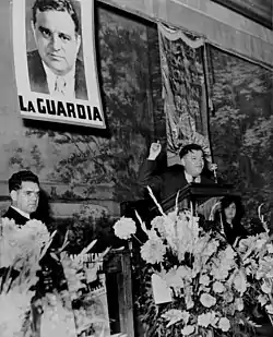 La Guardia announced that he would seek reelection as Mayor of New York City in the 1937 election and he was opposed for the Republican nomination by Almbert Fairchild, Thomas J. Curran, and Charles G. Bond.[95][96] All 475 delegates of the City Fusion Party voted unanimously to give their party's nomination to La Guardia, the American Labor Party voted unanimously to give its nomination to La Guardia, and he won the Republican primary.[97][98][99][100] He had won the Republican nomination despite his support for President Roosevelt in the 1936 presidential election.[3]