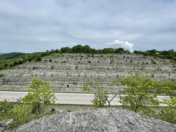 The Maysville roadcut, located in northeastern Kentucky, features Upper Ordovician rock and fossils. Maysville is located in Mason County, Kentucky and contains a large roadcut along the U.S. Route 68 highway. The Maysville roadcut lies on the Clyde T. Barbour Parkway. The roadcut was human-made in the 1950s and consists of rock from the Ordovician period that is roughly 450 million years old.[1] Maysville provides an opportunity to observe the stratigraphy of the formations present of the Ordovician time period.
