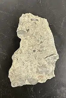 In order to access this formation, you must climb a trail on the south end of Maysville roadcut, where visitors should be wary of the ticks and poison ivy. This formation comprises many different fossils mostly found in abundant large slabs of limestone. These different fossils include a large amount of brachiopods smaller in size than the brachiopods found in the Bellevue formation as well as many brachiopod fragments. In addition, Fairview contains a large amount of small and broken crinoid stems. The Fairview formation contains an abundance of rock slabs, some of which have large cephalopods in them. Cephalopods are very abundant in the Fairview formation, and are larger in size than those found in the Kope formation, due to the increase in food availability for these predators following the late Cambrian period.[2] Cephalopods survived well in this time period because they were able to prey on the many gastropods and mollusks that are also found in this formation.[2] Visitors will find the majority of these fossils in the lower part of the Fairview formation as the upper part is difficult to access and potentially dangerous.