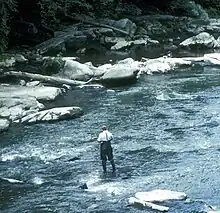 Whitewater boating is very popular on this part of Slippery Rock Creek and it is rated a Class II-III, on the International Scale of River Difficulty, depending on water conditions. Boating usually begins at the U.S. Route 422 bridge at Rose Point, outside the park boundary and passes under Eckert Bridge within the park before ending at Harris Bridge. There is a portage at the dam at the Old Mill. It is illegal to "run" the dam. All boaters are required to wear life jackets that are approved by the United States Coast Guard.[3]