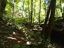 A mixed forest around the park. - Kildoo Trail is a "moderate" 2 miles (3.2 km) hiking trail loop. It begins and ends at the McConnells Mill Covered Bridge and follows the banks of Slippery Rock Creek. The western portion of the trail is marked with blue blazes and is also part of the North Country Trail.[3]