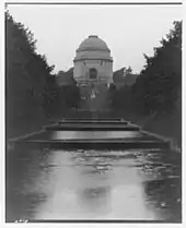 Over sixty designs were submitted, and Harold Van Buren Magonigle of New York City was selected as the winner of the competition. Magonigle envisioned a cross-hilted sword with a mausoleum located at the junction of the blade, guard, and hilt. The Long Water (a five-tiered reflecting pool which was 575 feet long) and main steps would form the handle of the sword. This design combined the cross of a martyr with the sword of a President who had acted as commander-in-chief during wartime.