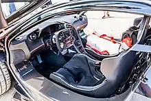 The P1 GTR's hybrid engine is rated at 1,000 PS (735 kW; 986 hp), representing an 84 PS (62 kW; 83 hp) increase over the standard production P1, although McLaren did not disclose whether the power increase was from electrical boost or tuning the twin-turbocharged 3.8-litre V8. Performance figures remain unconfirmed.[40] The weight of the P1 GTR was reduced by 50 kg (110 lb), achieving a power-to-weight ratio of 697 PS (513 kW; 687 hp) per 1 tonne (1.1 tons).[41] This equates to a weight-to-power ratio of 1.44 kg (3.17 lb) per horsepower. The car also featured slick tyres, and had greater levels of performance, grip, aerodynamics and downforce in comparison to the road car. Featuring a new fixed ride height on race-prepared suspension, a fixed rear wing capable of using DRS, and a new exclusively designed exhaust made of titanium and inconel. Due to its fixed rear wing, the GTR generates 10% more downforce than the road legal P1. The P1 GTR has a kerb weight of 1,440 kg (3,175 lb) which includes the weight of the batteries.[42]