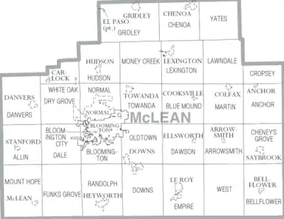 The first white settlers in what became McLean County arrived around 1821.[3]:69 The first settlement was Blooming Grove, established in 1822 near present-day Bloomington.[3]:69 McLean County was formed on December 25, 1830, out of Tazewell County. It was named for John McLean, United States Senator for Illinois, who died in 1830.[4]