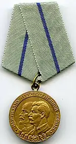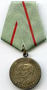 The Medal "To a Partisan of the Patriotic War"[2] (Russian: Медаль «Партизану Отечественной войны», Medal "Partizanu Otechestvennoi voiny") was a World War II Soviet paramilitary award established in two classes on February 2, 1943, by decree of the Presidium of the Supreme Soviet of the USSR.[1] to recognise the fortitude and courage of the partisans on the home front in their struggle to free the Soviet Motherland of the Nazi invaders far behind enemy lines. Its statute was amended by a further decree of the Presidium of the Supreme Soviet of the USSR on February 26, 1947.[3]