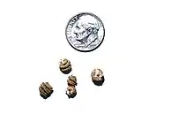 Seed pods of Medicago noeana next to a U.S. dime for scale.