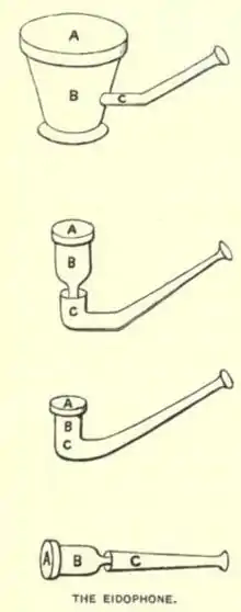 In 1885, while seeking means to indicate readily the intensities of vocal sounds, I first met with these [voice] figures, and, owing to their variety both in form and production, they have since absorbed much of my attention. The apparatus I have employed I call the eidophone. This is very simple. It consists merely of an elastic membrane, such as thoroughly flexible soft sheet-rubber, tightly stretched over the mouth of a receiver of any form, into which receiver the voice is introduced by a wide-mouthed tube of convenient shape. In some cases the receiver may be dispensed with, and the membrane be stretched across the open end of the tube itself.[11][13]