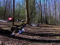 Campsite 20 is flanked by two small streams to the east and Kiver Branch and Blanket Creek to the west. The campsite, which occupies a broad, flat slope at the northern base of Blanket Mountain, is relatively large compared to other backcountry campsites in the park. Mechanical detritus from the early 20th century is scattered around Blanket Creek, and the remnants of a stone wall is visible immediately downstream from the trail.