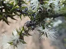 The plant flowers profusely but the white or cream-coloured flowers occur singly within the foliage of the shrub and are sweetly scented.[4] The petals are 2.2–2.8 mm (0.087–0.11 in) long and fall off as the flower opens. The stamens are in five bundles around the flower, each bundle containing 8 to 13 stamens. (In Melaleuca podiocarpa there are 30 to 45 stamens per bundle.) The main flowering season is in September and the fruit which follow are woody capsules 4–5 mm (0.16–0.20 in) long.[2][3]