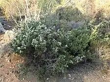 Melaleuca cliffortioides grows to a height of about 1.6 m (5 ft). Its branchlets are densely covered with soft, fine hairs. The leaves are arranged alternately, 4–9 mm (0.2–0.4 in) long, 1.6–2.5 mm (0.06–0.1 in) wide, narrow oval to egg-shaped, tapering to a sharp point and have many prominent oil glands.[2][3]