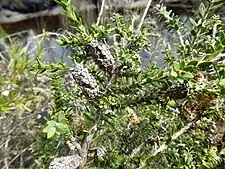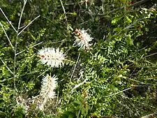 The flowers are arranged in spikes, usually on the ends of branches which continue to grow after flowering. Each spike has between 6 and 55 individual flowers and is up to 30 mm (1 in) long and 15 mm (0.6 in) wide, white, creamy white or yellow. The petals are 0.7–2.0 mm (0.03–0.08 in) long and fall off as the flower ages. The stamens are arranged in five bundles around the flower, each bundle containing between 3 and 11 stamens. Flowering occurs in spring and is followed by fruit which are woody capsules 1.5–4 mm (0.06–0.2 in) long in cylinder-shaped clusters up to 30 mm (1 in) long.[4][5]