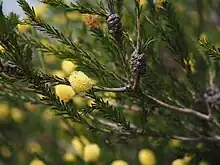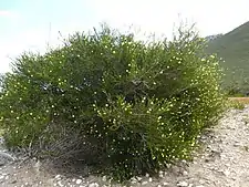 The bright yellow flowers are arranged in oval-shaped spikes, often on the ends of branches which continue to grow after flowering. The spikes contain 10 to 18 groups of flowers in threes, densely packed together, each spike up to 25 mm (1 in) long. The stamens are in five bundles around the flower, each bundle with 5 to 9 stamens. Flowering occurs in late spring and the fruit which follow are rounded, woody capsules 2–5 mm (0.08–0.2 in) long in tight clusters along the stem.[2][3]