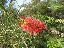 The flowers are bright red or orange-green and arranged in spikes on the ends of branches which continue to grow after flowering and also on the sides of the branches. The spikes are 40–55 mm (1.6–2.2 in) in diameter with 12 to 55 individual flowers. The petals are 3.5–7.4 mm (0.1–0.3 in) long and fall off as the flower ages and there are 25–42 stamens in each flower. Flowering occurs in spring and is followed by fruit which are woody capsules, 5.5–7.1 mm (0.2–0.3 in) long.[3][4]
