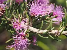 The flowers are a shade of pink to purple and arranged in heads on the ends of branches which continue to grow after flowering and sometimes also in the upper leaf axils. The heads are up to 18 mm (0.7 in) in diameter with up to 3 groups of flowers in threes. The petals are 1.0–1.2 mm (0.04–0.05 in) long and fall off as the flower matures. The outer surface of the floral cup (the hypanthium) is usually hairy and there are five bundles of stamens around the flower, each with 4 to 7 stamens. Flowering occurs mainly in September and October, and is followed by fruit which are woody, cup-shaped capsules, 3.8–5 mm (0.1–0.2 in) long, scattered along the stem.[2][3]