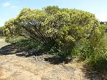 The flowers are yellow to white and arranged in heads or short spikes on the sides of the branches. Each head contains 4 to 13 groups of flowers in threes and is up to 15–17 mm (0.6–0.7 in) in diameter. The petals are 0.9–2 mm (0.04–0.08 in) long and fall off as the flower matures. There are five bundles of stamens around the flower, each with 3 to 7 stamens. Flowering occurs between August and October and is followed by fruit which are woody capsules, 1.8–2.2 mm (0.07–0.09 in) long in tight, almost spherical clusters.[2][3]