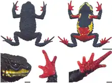 | Holotype of M. xanthostomus, an adult male. Top: dorsal and ventral views. Bottom: head, hand, and foot. | |