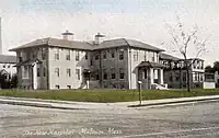 The first hospital was in a former residence located at 39 Oakland Street, but it soon became too small for the association's needs so it purchased and moved to a home at 75 Myrtle Street. In 1894, the association purchased a plot of land on the corner of Lebanon and Porter Streets at 585 Lebanon Street where it moved to in 1913, and remains today.[4][5] Also in 1894, the Melrose Hospital School of Nursing opened in order to assure a continuous source of qualified labor.[5]